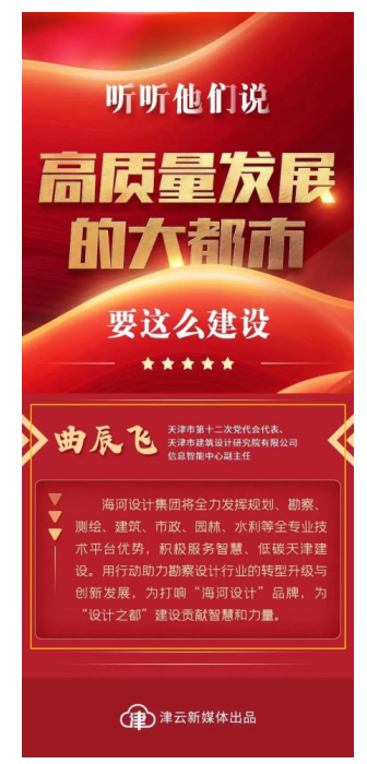 黨代會(huì)期間,曲辰飛認(rèn)真履行代表職責(zé),積極參加分組討論,并以“打造‘智慧低碳’建筑 助力城市高質(zhì)量發(fā)展”為主題進(jìn)行建言獻(xiàn)策,先后接受天津電視臺(tái)、天津日?qǐng)?bào)、津云、今晚報(bào)等主流媒體的采訪,代表國(guó)資系統(tǒng)、海河設(shè)計(jì)集團(tuán)發(fā)出了基層國(guó)企的聲音,貢獻(xiàn)了天津建院人的智慧和力量。